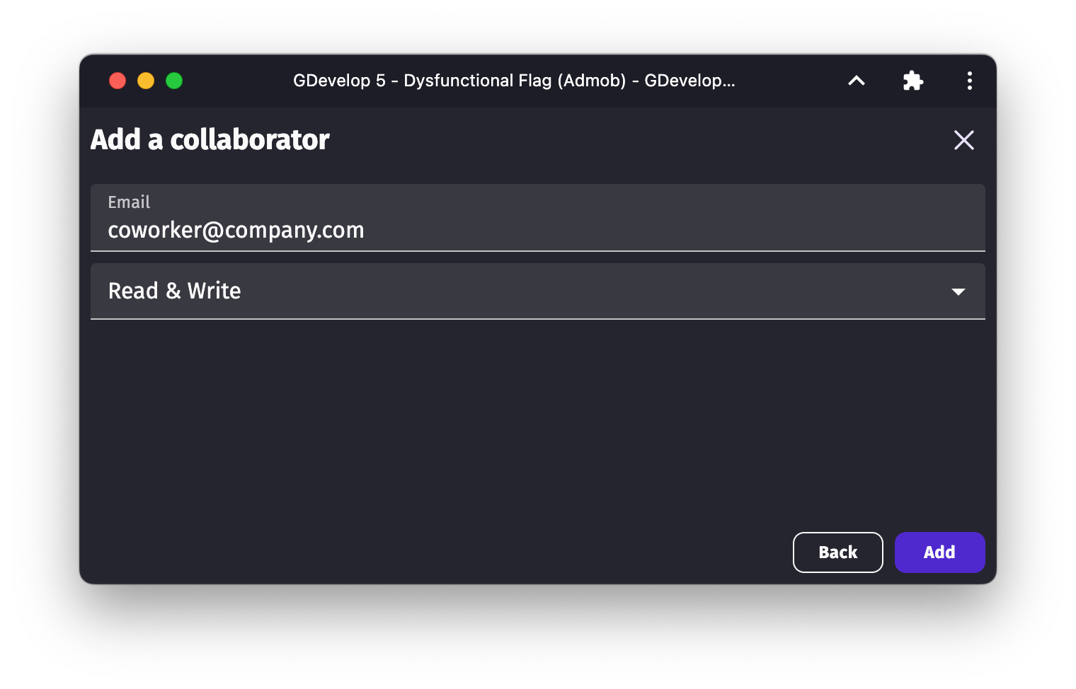 GDevelop allows you to share your project with other users, for example teammates or co-workers. This allows these users to open and modify the project when you're not editing it. Note that real-time collaboration is not yet ready and will be added in the future.