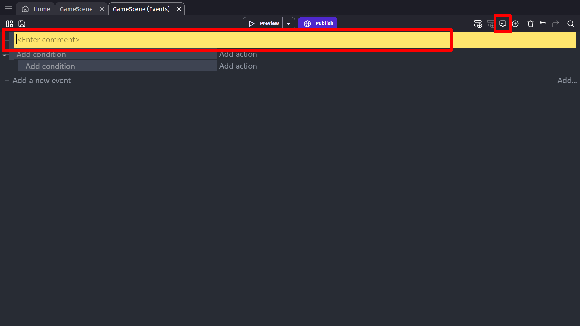 By clicking the "Add a comment" button, you can add a comment block to the list of events. Comments are useful to add explanations to complex events, or to help separate and organize your events. They can contain any text.