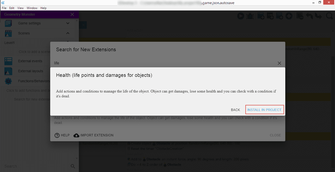 This introduces a behavior called "Health", which we can then manipulate in our game to manage the life of an object. Click "Install in project" to be able to use it.