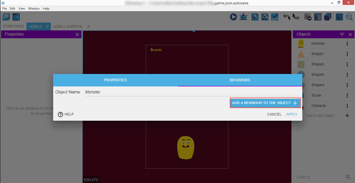 Click on the "Level1" to go back to the scene editor, then in the right panel with the "Objects" double click on the "Monster" - it will open a popup.