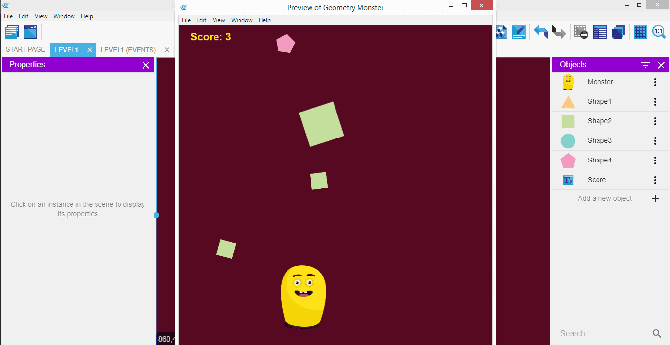 This is in fact a bit incomplete: in case we're collecting two shapes at the very same time, we'll only get one point! This is because the condition will be considered "true" for both shapes that are colliding with the monster, but the action is then only run once. We'll fix that in a few moments with a "For Each" event.
