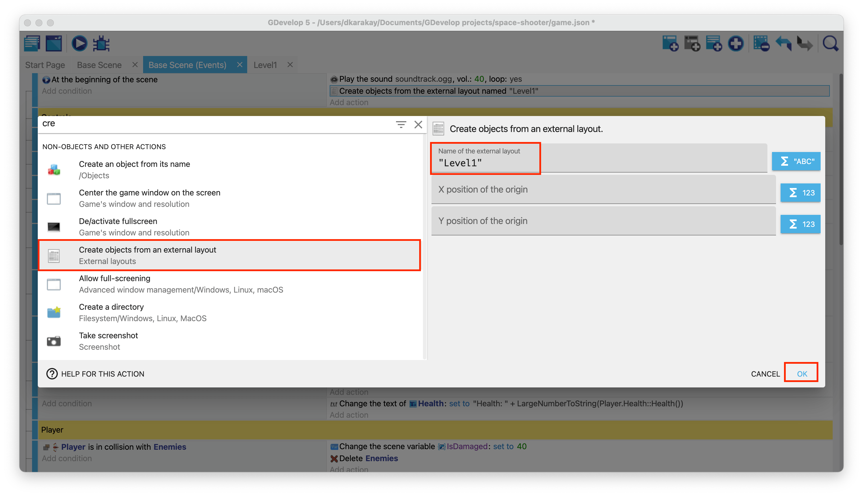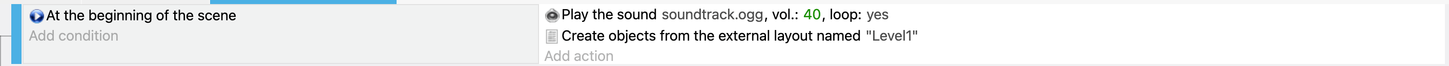 Open the events tab, and add a new action under the At the beginning of the scene event. Select Create objects from external layout and enter the name of our external layout, in that case, Level1.