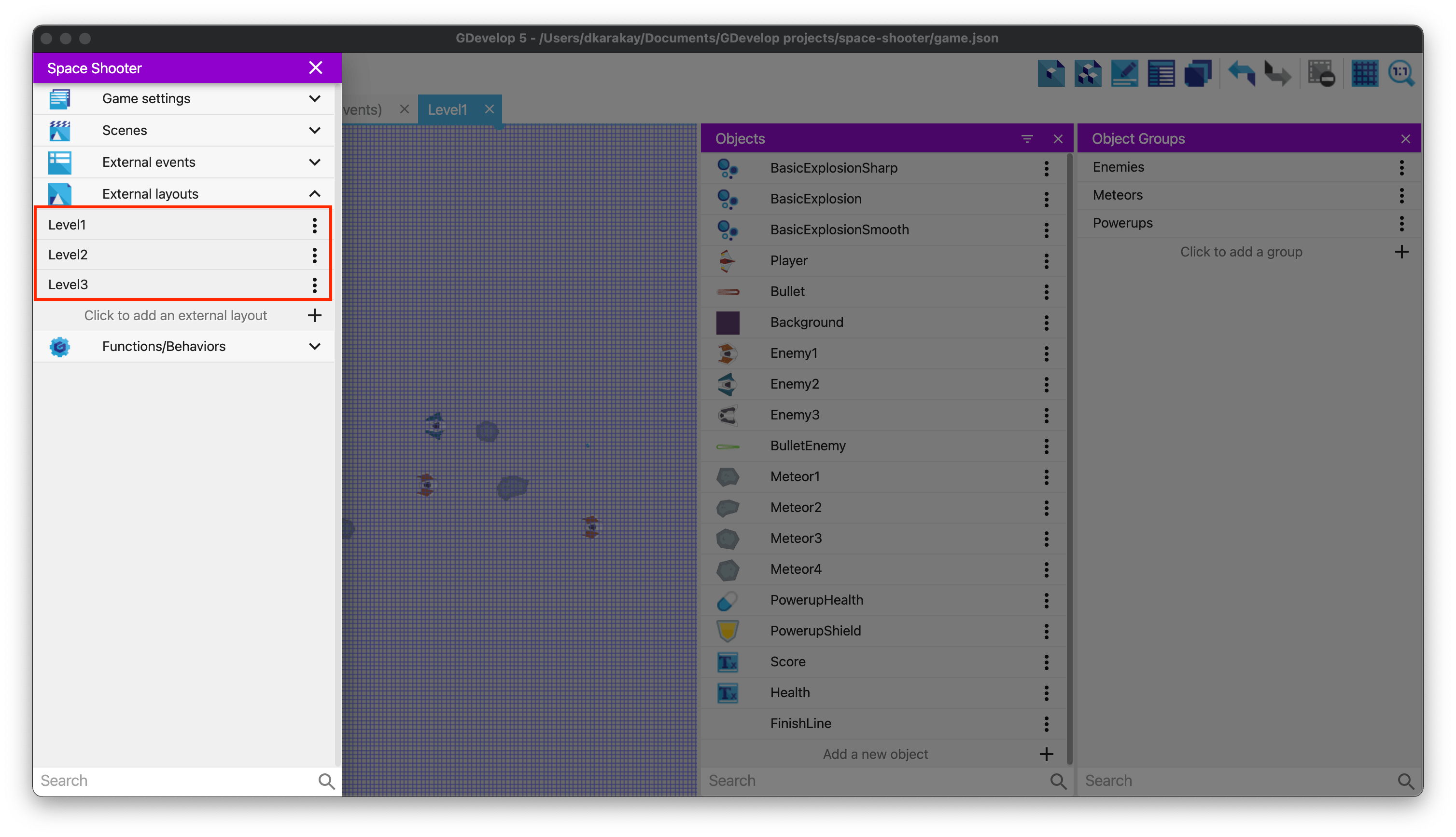 We can now go back to our external layout and design our level by dragging and dropping the objects.