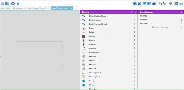 We will use External Layouts to create new levels. The external layout can create a layout of objects, just as in a scene editor. The objects can be then dynamically inserted in a scene using the actions in the External layouts category. Create a new external layout from the project manager panel. Then, select the Base Scene as an associated scene. Change the name of the external layout with Level1.
