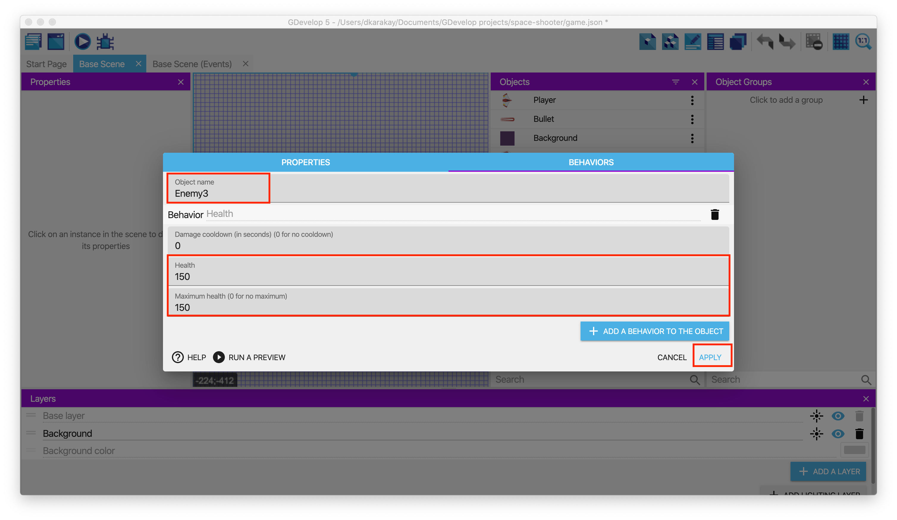 Open the behavior page of Enemy3 and change Health & Maximum Health to 150.
